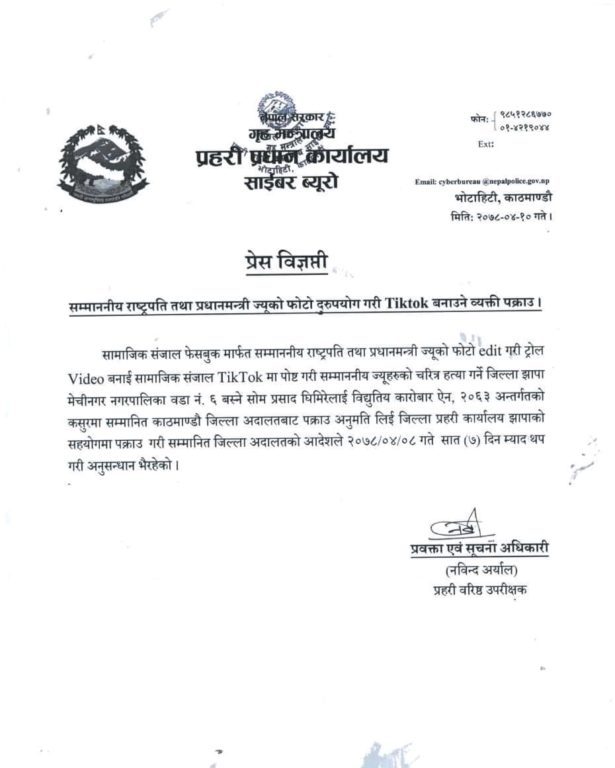 काठमाडौ,साउन १० । नेपाल प्रहरीले राष्ट्रपति र प्रधानमन्त्रीको फोटो दुरुपयोग गरेर टिकटक बनाउने एक जनालाई पक्राउ गरेको छ ।