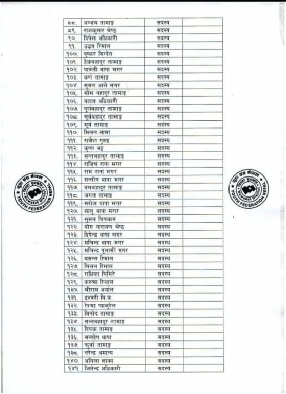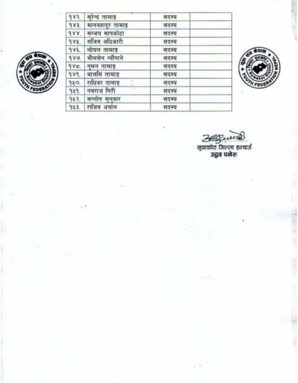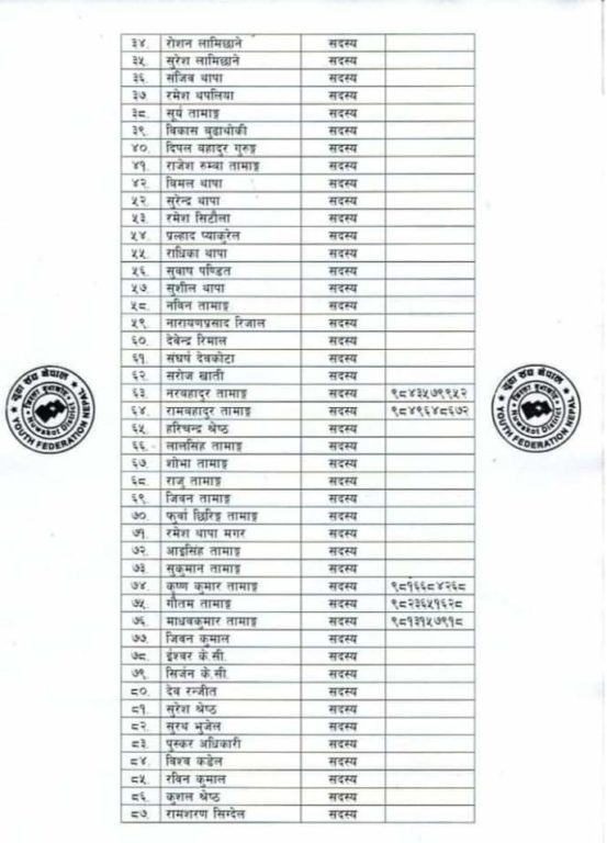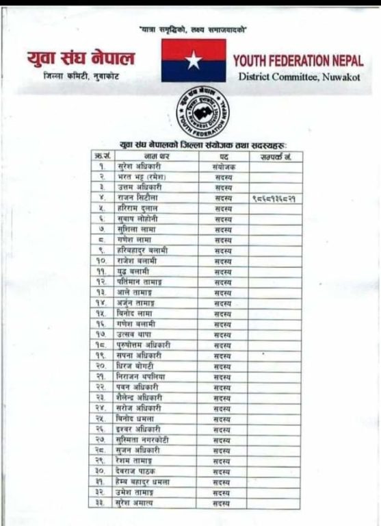 माधवकुमार नेपाल पक्षीय युवासंघ नेपाल नुवाकोटका ईन्चार्ज उद्धव पनेरुकाे अध्यक्षतामा बसेकाे भेलाले नुवाकाेट सह-ईन्चार्ज सुरेश अधिकारिकाे संयाेजकत्वमा १५३ सदस्यीय युवासंघ नेपाल नुवाकाेट जिल्ला आयाेजक कमिटि घाेषणा गरिएकाे संयाेजक अधिकारीले बताए।