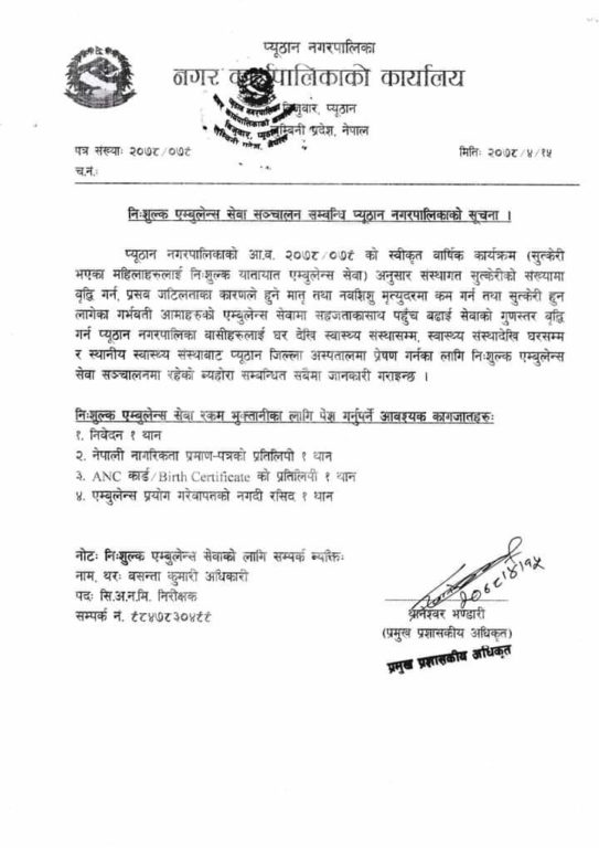 आर्थिक बर्ष ०७८/०७९ को स्वीकृत बजेट कार्यक्रम अनुसार नगरपालिका भित्रका सुत्केरी महिलाहरुका लागि कुनै पनि स्वास्थ्य संस्थासम्म जान र घर फर्कन निःशुल्क एम्बुलेन्सको व्यवस्था गर्ने निर्णय गरिएको प्युठान नगरपालिकाका प्रमुख प्रसासकिय अधिकृत थानेश्वर भण्डारीले भन्नुभयो । १० वटा वडा रहेको नगरपालिकामा अधिकतम महिलाहरुले प्रसुती सेवा लिन सक्ने स्वास्थ्य शाखाको बिश्वास छ। नगरपालिका भित्रका ६ वटा वडामा बर्थिङ सेन्टर रहेका छन भने अन्य वडाका महिलाहरुले पायक पर्ने स्वास्थ्य सस्थाबाट प्रसुती सेवा लिने गरेको र अहिले पनि केही प्रतिशत महिला घरैमा सुत्केरी हुने गरेको स्वास्थ्य शाखाका प्रमुख गोबिन्द घिमिरेले बताउनुभयो। ‘नगरपालिकाको यस्तो निर्णयले यस वर्ष स्वास्थ्य संस्थामा जोखिम रहित सेवा लिने बढ्नेछन’ उहाले भन्नुभयो।
