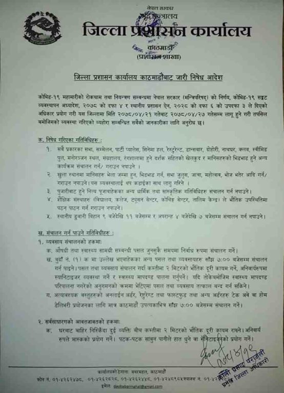 काठमाडौ,साउन १९ । उपत्यका काठमाडौंसहितका प्रमुख जिल्ला अधिकारीको बैठकले जारी निषेधाज्ञा एक साता थप गर्ने निर्णय गरेको छ। ललितपुरका प्रमुख जिल्ला अधिकारी ढुण्डीप्रसाद निरौलाका अनुसार कोरोनाको संक्रमणदर पछिल्लो समय बढ्दै गएकोले यसलाई नियन्त्रण गर्न प्रमुख जिल्ला अधिकारीको टोली र सूरक्षा निकायले जनस्वास्थ्य मापदण्ड पालना भएको वा नभएको बारेमा प्रभावकारी रुपमा अनुगमन गर्ने निर्णय भएको छ।
