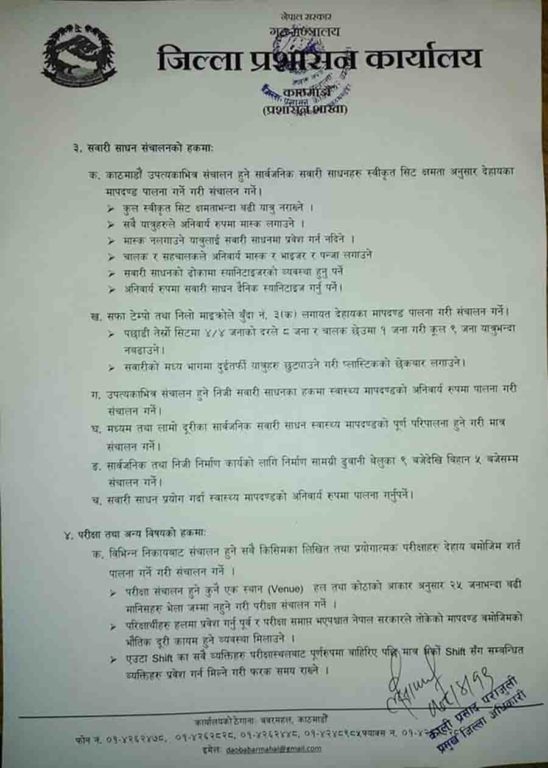 साथै कोरोनाको परीक्षण दायरा बढाउने विषयमा समेत बैठकमा निर्णय भएको छ । साथै यस्तै अवस्थामा संक्रमणको दर बढ्दै गएमा निषेधाज्ञा नियमलाई फेरबदल आगामी दिनमा गर्ने विषयमा छलफल भएको समेत प्रजिअ निरौलाले बताउनुभयो । छिल्लोपटक थप गरिएको निषेधाज्ञाको अवधि बुधवार राति १२ पछि सकिँदैछ भने उपत्यकामा गएको वैशाख १६ गतेदेखि निषेधाज्ञा लागू गरिएको थियो ।