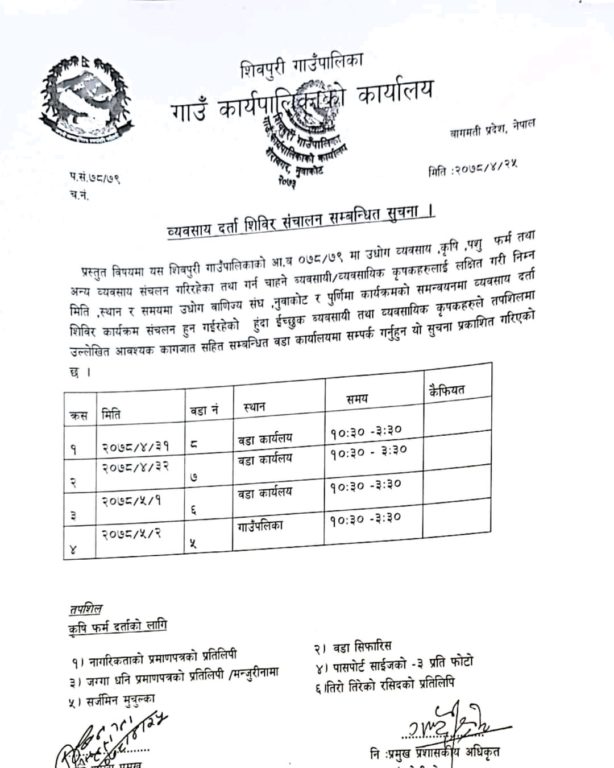 नुवाकोट शिवपुरीमा साउन ३१ गतेदेखि व्यवसाय दर्ता शिविर
