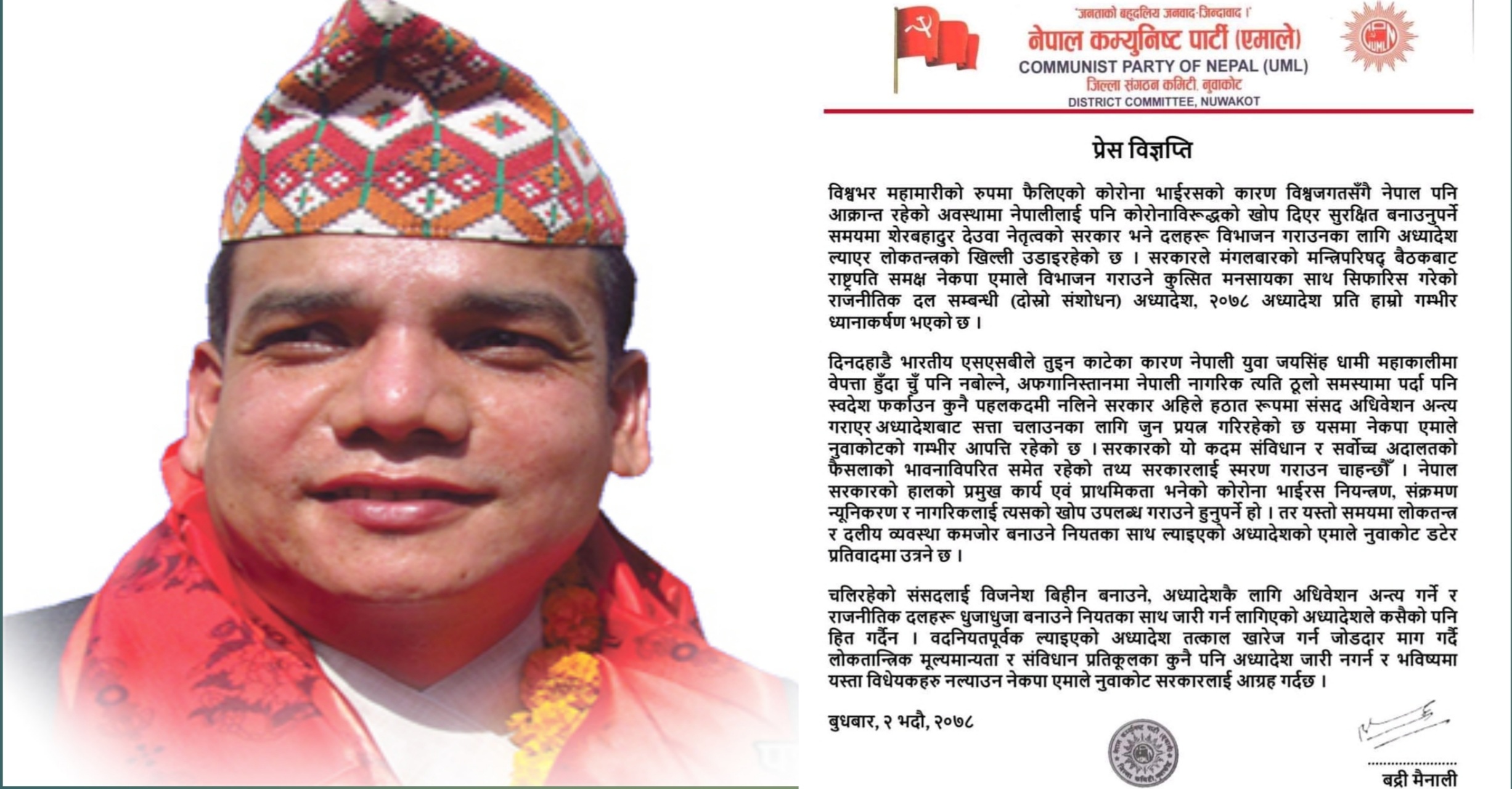 एमाले नुवाकोटका अध्यक्ष बद्री मैनालीले एक विज्ञप्ति जारी गर्दै सरकारको गलत कामको प्रतिवाद गर्ने जनाएका हुन । विज्ञप्तिमा नागरिकका लागि कोरोनाविरूद्धको खोप सुनिश्चत गर्न लाग्नुपर्नेमा सरकार लोकतन्त्र र संविधानका व्यवस्थामाथि प्रहार गर्न लागि परेको भन्दै आपत्ति प्रकट गरिएको छ ।