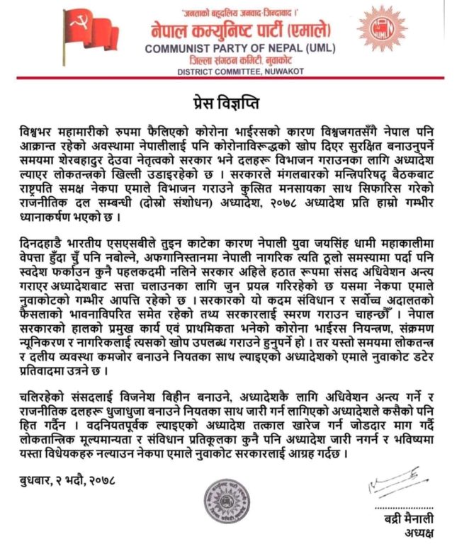 नुवाकोट,भदौ २ । नेकपा एमाले नुवाकोटले दल विभाजन सम्बन्धी अध्यादेशको डटेर प्रतिवाद गर्ने जनाएको छ ।