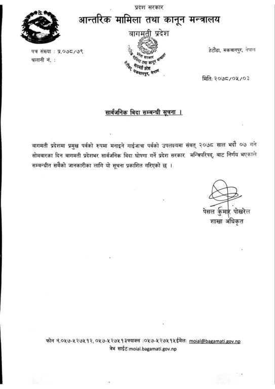 मन्त्रालयले एक सूचना जारी गर्दै सार्वजनिक बिदा सम्बन्धि जानकारी गराइएको हो ।