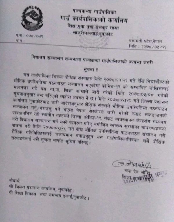 जिल्ला प्रशासन नुवाकोटद्वारा जारी आदेश अनुसार कक्षा सञ्चालन गर्न लागिएको गाउँपालिकाले जनाएको छ।