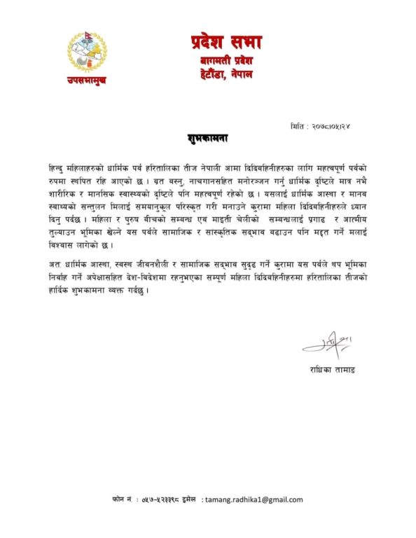 काठमाडौं,भदौ २३ । हरितालिका तीजको अवसरमा वाग्मती प्रदेशकी उपसभामुख राधिका तामाङले शुभकामना व्यक्त गरेकी छन् ।