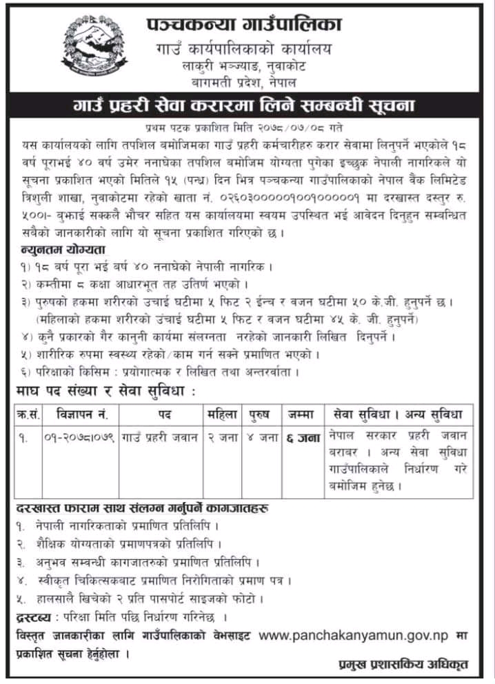 नुवाकोट पञ्चकन्यामा करारमा ६ जना प्रहरी माग