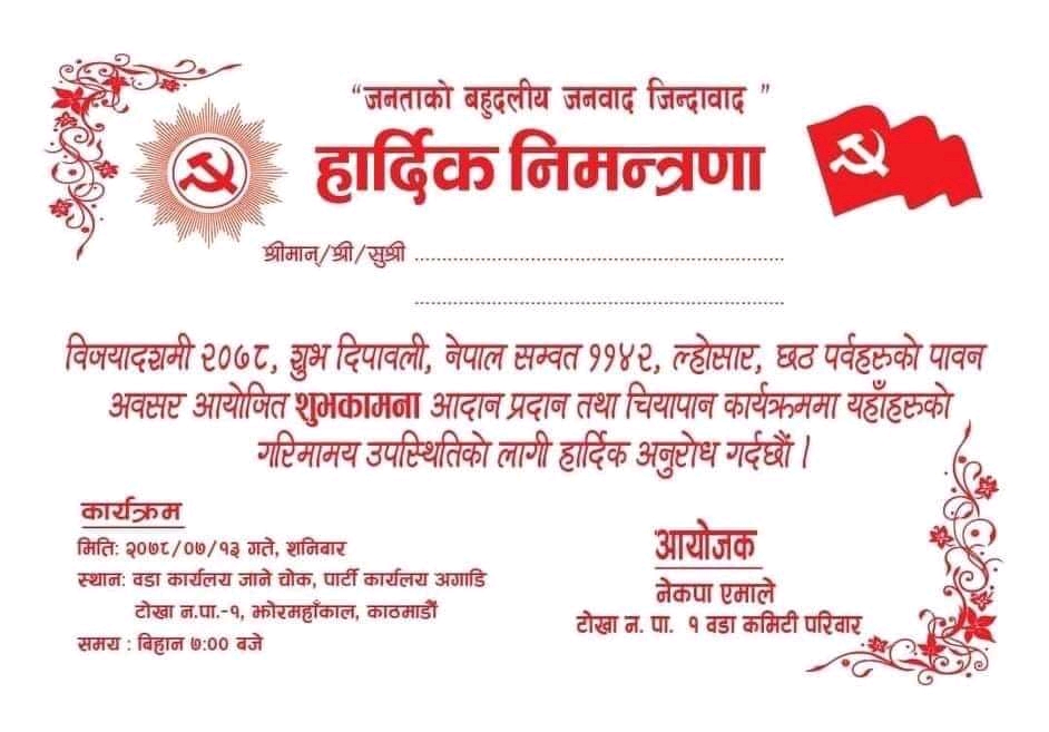 नेकपा एमाले टोखा नगरपालिका वडा नम्बर १ द्वारा तिहार, छठ तथा ल्होसार पर्वको उपलक्ष्यमा आयोजित शुभकामना तथा चियापान कार्यक्रममा सहभागीता जनाउन नेता संग्रौलासहित नेकपा एमालेका नेता तथा काठमाडौं महानगरका पूर्व मेयर केशव स्थापितको पनि कार्यक्रममा आतिथ्यता रहनेछ।