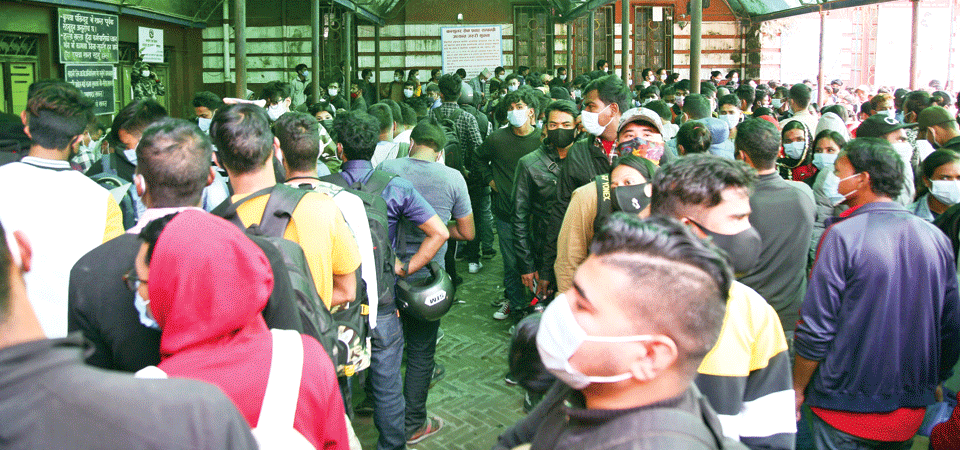 काठमाडौं,कात्तिक १५ । राहदानी बनाउनेको भीड आइतबार हालसम्मकै उच्च बनेको छ । आइतबार पाँच हजार जनाले राहदानी बनाउनका लागि आवेदन भर्नका लागि टोकन लिएका थिए । परराष्ट्र मन्त्रालयको प्रमुख अङ्गका रूपमा रहेको राहदानी विभागमा आइतबार झिसमिसे नहुँदै राहदानी बनाउनेको लाम सुरु भएको थियो । जुन बढ्दै गएर दिउँसो अनियन्त्रित भीडमा परिणत भएको थियो । जसका कारण विभागसँगै जोडिएको सडकमार्ग पटक–पटक अवरुद्ध हुुन पुगेको थियो । विभागका कर्मचारी कृष्णहरि घिमिरेले भन्नुभयो, “जागिर खाएको यत्रो वर्ष भयो तर राहदानी बनाउनेको भीड यसैपाला देखेको हो ।” अति भीडका कारण विभागका कर्मचारीलाई पनि व्यवस्थापन गर्न हम्मे–हम्मे परेको उहाँले बताउनुभयो ।