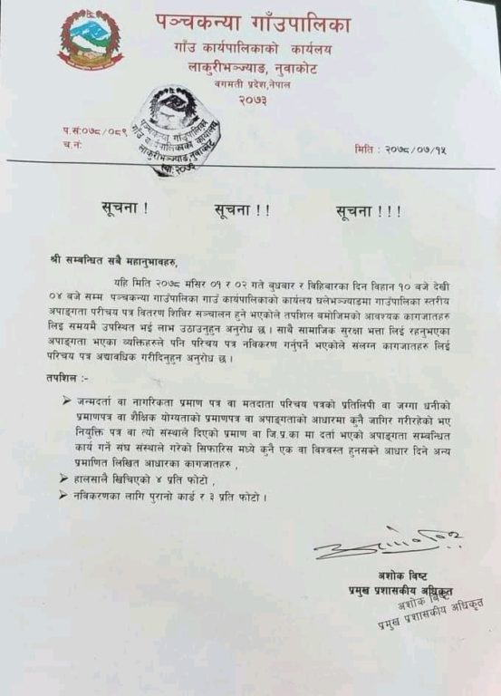 गाउँपालिकाका प्रमुख प्रशासकीय अधिकृत अशोक बिष्टद्वारा हस्ताक्षरित सूचनामा आउदो मंसिर १ र २ गते सो परिचयपत्र वितरण गर्न लागिएकोले आवश्यक कागजातसहित अन्य सामाजिक सुरक्षा भत्ताको सुविधा लिइरहेका नागरिकले समेत कार्यालय समयमा उपस्थित हुन अनुरोध गरिएको छ।
