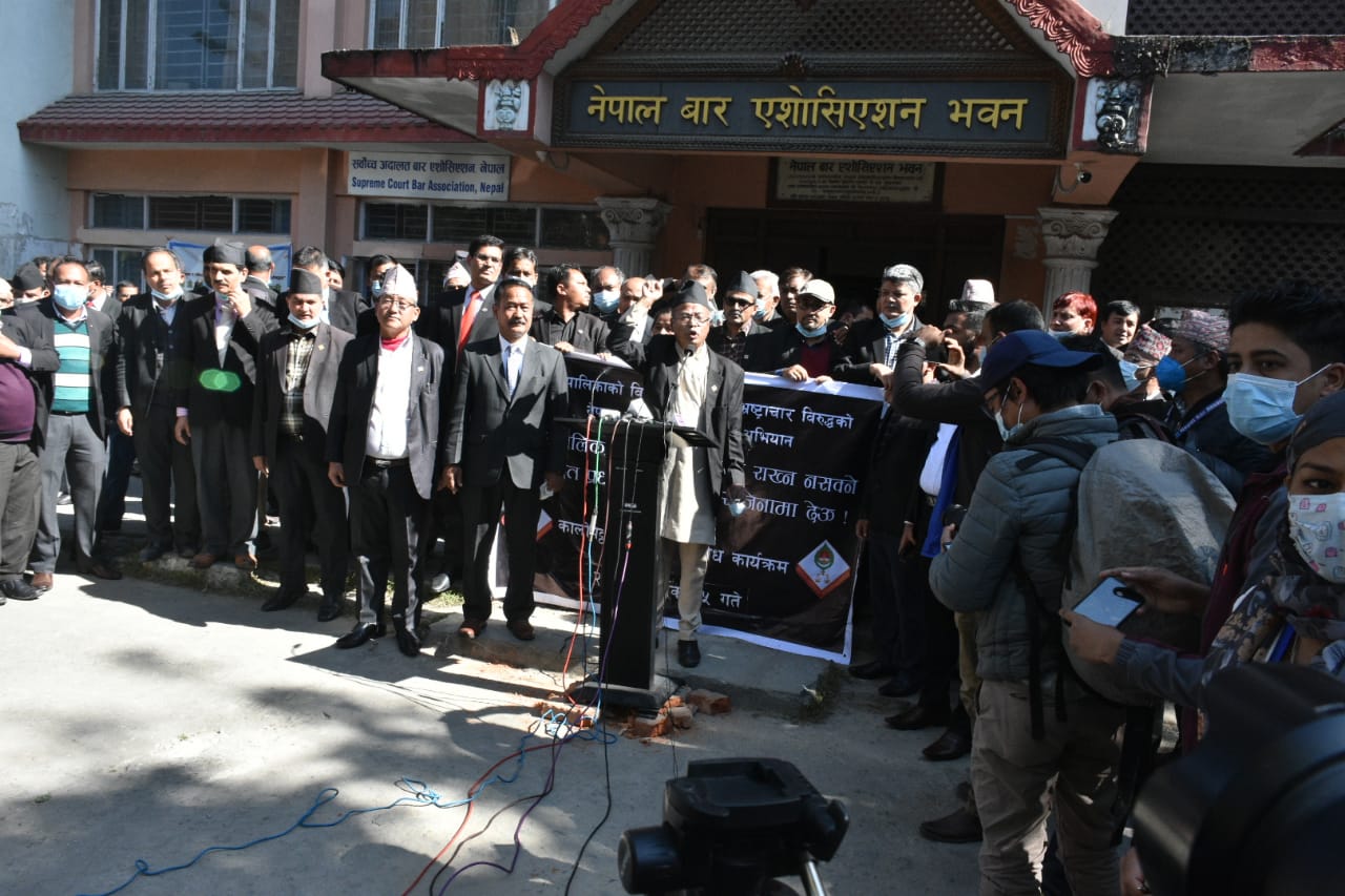 १४ कात्तिकदेखि नेपाल बार एसोसिएसनले प्रधानन्याधीश जबराको राजीनामा माग्दै सर्वोच्च अदालत परिसरमा दैनिक १ घण्टा धर्ना दिइरहेको छ । बिहीबार साढे १० बजे पाखुरामा कालोपट्टी बाँधेर ‘प्रधानन्यायाधीश राजीनामा देऊ’ लेखिएको कालो ब्यानर बोकेर सर्वोच्च बारको आँगनमा विरोध सभा गर्दा प्रहरीले रोकेको थियो । प्रहरीले विरोध सभा रोक्न खोजेपछि कानुन व्यवसायी र प्रहरीबीच झडपको स्थिति बनेको थियोे।