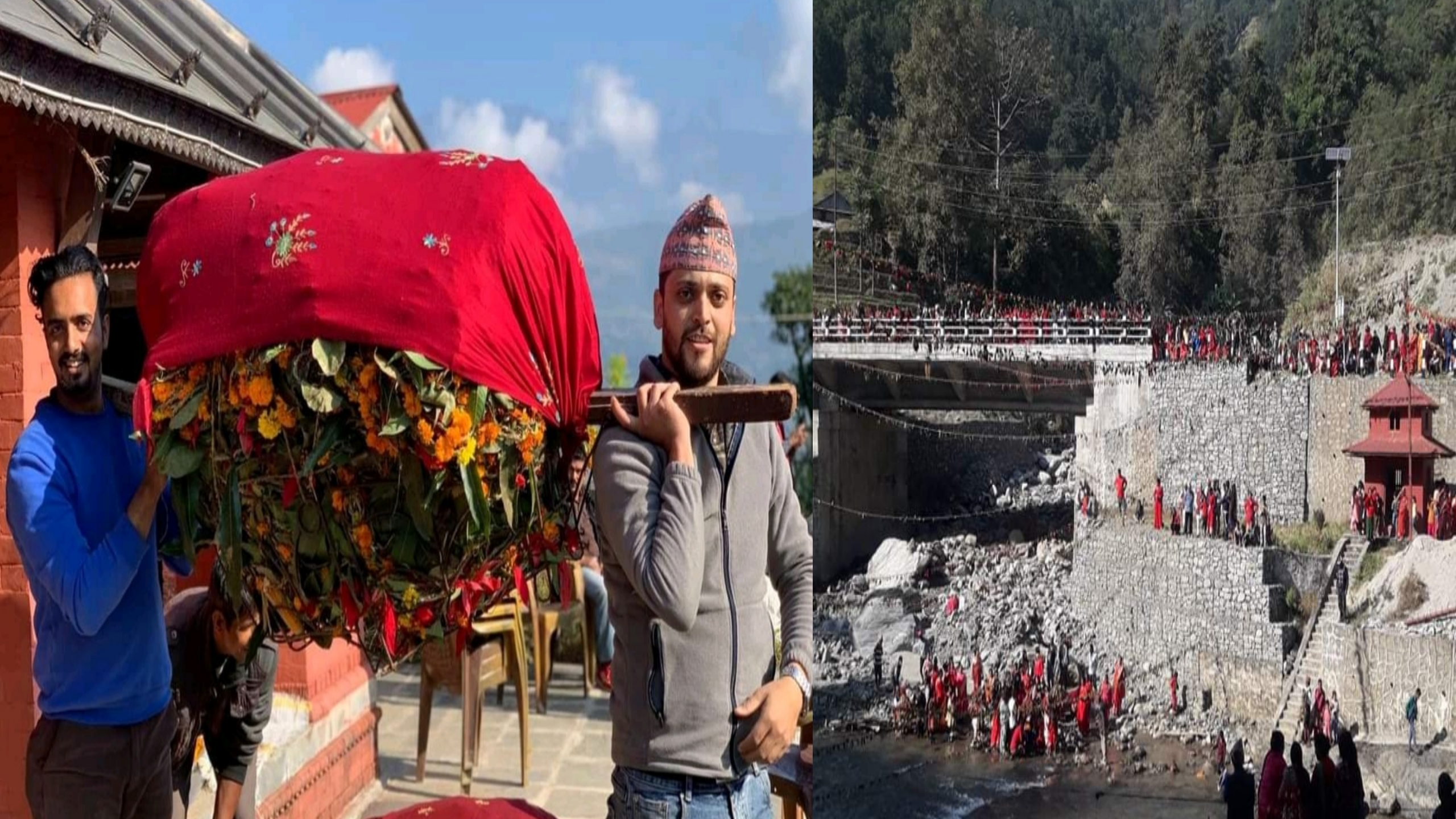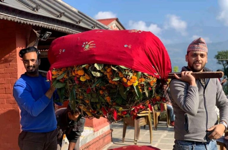 नुवाकोटको त्रिवेणी धाममा एकादशी: बाजागाजासहित बेहुली झैँ ल्याइएका २० वटा फूलको डोली तारिए