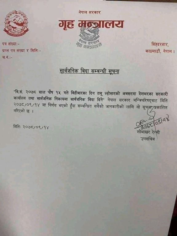काठमाडौं,पुस १४ । सरकारले भोलि सार्वजनिक बिदा दिएको छ।