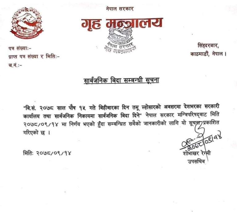 बुधबार बसेको मन्त्रिपरिषद् बैठकले सो निर्णय गरेको हो। सरकारको निर्णयअनुसार देशभरका सबै सरकारी कार्यालय तथा सार्वजनिक निकाय र विदेशस्थित कुटनैतिक नियोगमा समेत सार्वजनिक विदा दिइने छ ।