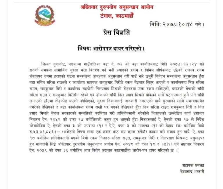 अख्तियारले विज्ञप्तिमा भनेको छ, ‘भ्रष्टाचार निवारण ऐन, २०५९ को दफा १७ बमोजिमको कसुर हुन आएको हुँदा निजहरुलाई ऐ. ऐनको दफा १७ ले निर्देश गरेबमोजिम ऐ. ऐनको दफा ३ को उपदफा (१) र ऐ.ऐ. दफा ३ को उपदफा (१) को देहाय (ज) बमोजिम बिगो रु.५३,०१,८५६।– (अक्षेरुपी त्रिपन्न लाख एक हजार आठ सय छपन्न रुपैयाँ) कायम गरी सजाय हुन साथै, ऐ. दफा १७ बमोजिम हानिनोक्सानी भएको बिगो रकम निजहरु सरिता राउत, रामकुमार गिरी र निलप्रसाद मिश्रबाट असुलउपर हुन मागदाबी लिई अख्तियार दुरुपयोग अनुसन्धान आयोग ऐन, २०४८ को दफा १८ र ३५(१) एवं भ्रष्टाचार निवारण ऐन, २०५९ को दफा ३६ बमोजिम आज बिशेष अदालत काठमाडौंमा आरोप-पत्र दायर गरिएको छ ।’