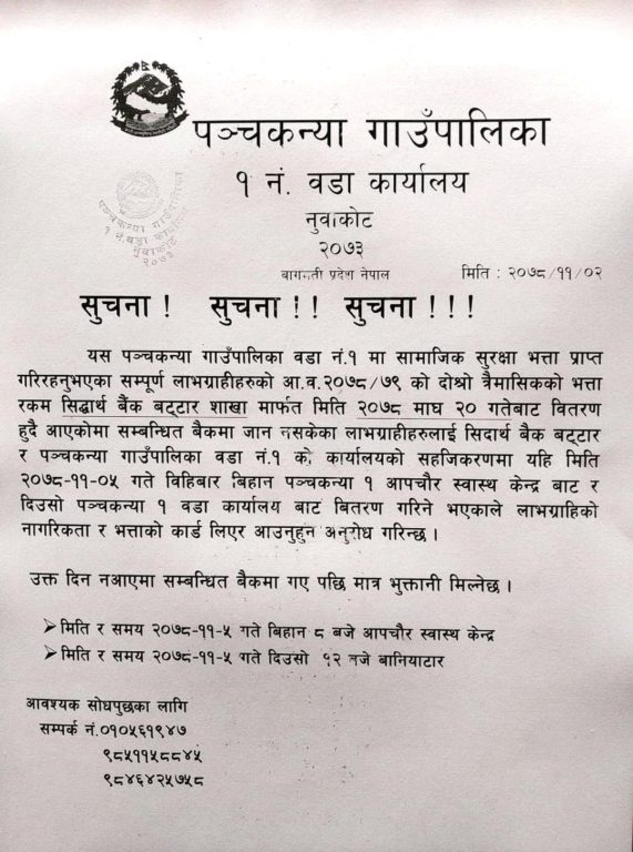 नुवाकोट,फागुन २ । जिल्लाको पञ्चकन्या गाउँपालिकाको सामाजिक सुरक्षा भत्ता वितरण हुने भएको छ ।