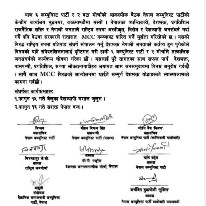 नेपालका क्रान्तिकारी, देशभक्त, प्रगतिशील राजनीतिक शक्ति र जनताले देशव्यापी जनसंघर्ष गर्दागर्दै देउवा सरकारले रातारात एमसीसी कम्प्याक्ट रातारात पारित गर्ने मुर्खता गरिरहेको ती दलहरुद्वारा जारी विज्ञप्तिमा उल्लेख छ ।