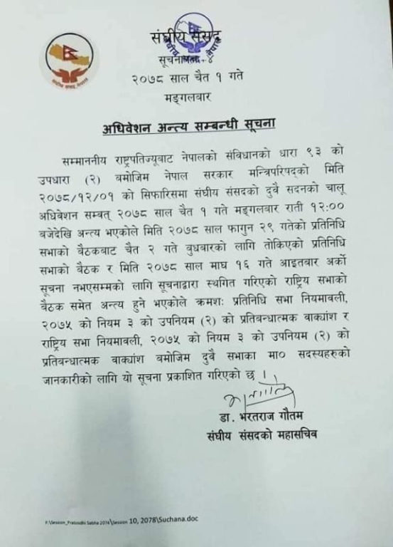 मंगलबार दिउँसो बसेको मन्त्रीपरिषदको बैठकले राती १२ बजेदेखि संसदको अधिवेशन अन्त्य गर्न सिफारिस गरेपछि राष्ट्रपति भण्डारीले संघीय संसदका दुवै अधिवेशन अन्त्य गर्नुभएको हो ।