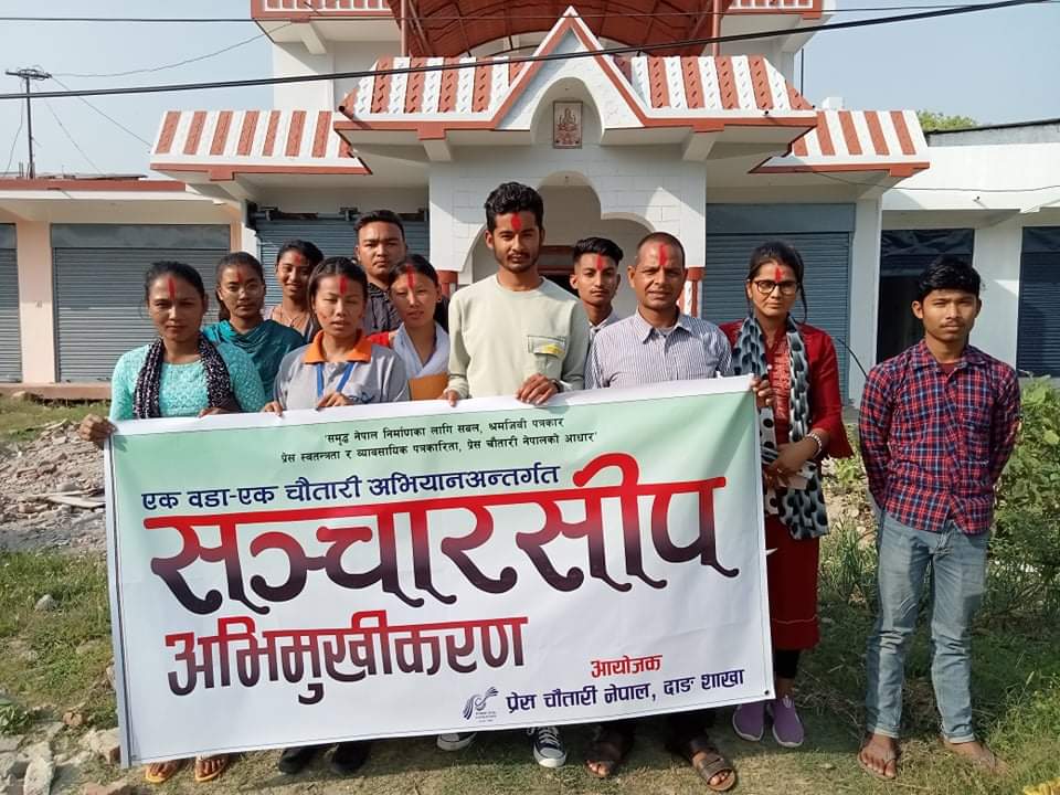 आज प्रेस चाैतारी नेपाल दाङ शाखाले मसुरीयामा आयोजना गरेको सञ्चार सीप सम्वन्धी अभिमुखीकरण कार्यक्रम पश्चात् सो संगठन विस्तार गरिएको हो । जसको सचिवमा माधव खनाल चयन भएका छन् । भने सदस्यहरूमा हुमा सुनार, रेश्मा केसी, लक्ष्मण रोका मगर, सुरेश चाैधरी, सागर चाैधरी, शोभा चाैधरी,सैना चाैधरी, लक्ष्मी पोख्रेल, दिलबहादुर पुन मगर, प्रज्वल ज्ञवाली, मनोज चाैधरी र राजन चाैधरी रहेका छन् ।