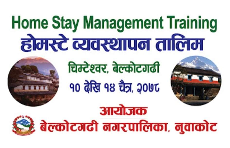 नुवाकोट,चैत ११। बेल्कोटगढी नगरपालिकाको ऐतिहासिक क्षेत्र चिम्टेश्वरमा होमस्टे व्यवस्थापन तालिम कार्यक्रम सुरु भएको छ । तालिम कार्यक्रमको उद्घाटन गर्दै बेल्कोटगढी नगरपालिकाका प्रमुख राजेन्द्र रमण खनालले नगरपालिकाको ऐतिहासिक र सांस्कृतिक स्थल चिम्टेश्वर क्षेत्रको विकासको लागी होमस्टे तालिमले महत्वपूर्ण भूमिका खेल्ने बताउनु भयो । खनालले होमस्टे संचालनको लागी नगरपालिकाबाट तत्काललाई तामाङ जातिको पहिचान झल्कने भेषभुषा र बाजा किन्न सहयोग उपलब्ध गराउने प्रतिवद्धता समेत व्यतm गर्नु भयो ।