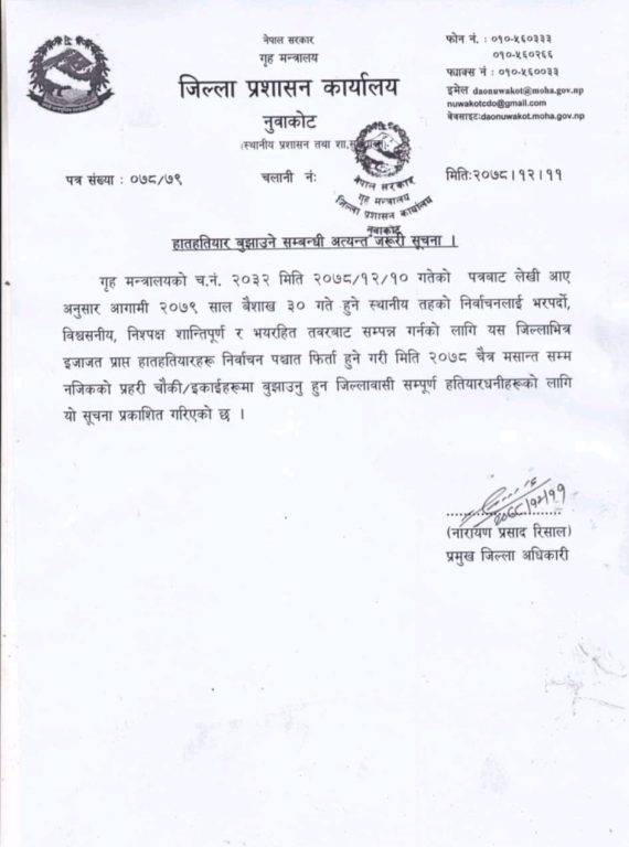 विभिन्न प्रयोजनले राखिएको हातहतियार बुझाउन जिल्ला प्रशासन नुवाकोटको अनुरोध