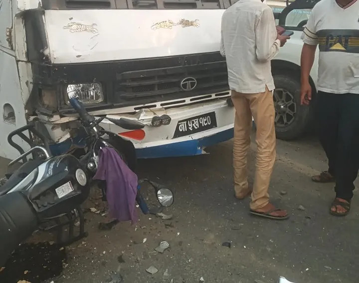 पूर्वबाट पश्चिम तर्फ आउँदै गरेको ना ५ ख १९० नम्बरको नारायणी यातायातको बसले पश्चिमबाट पूर्व तर्फ जादै गरेको बागमती प्रदेश ००२ प १८९५ नम्बरको मोटरसाइकललाई आज साँझ पौने ५ बजे ठक्कर दिएको हो ।