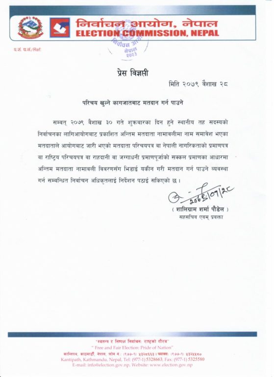 बुधबार प्रेस विज्ञप्तिमार्फत आयोगले मतदाता नामावलीमा नाम भएका सबैले परिचय खुल्ने कागजातका आधारमा मतदान दिन पाउने व्यवस्था मिलाएको हो ।