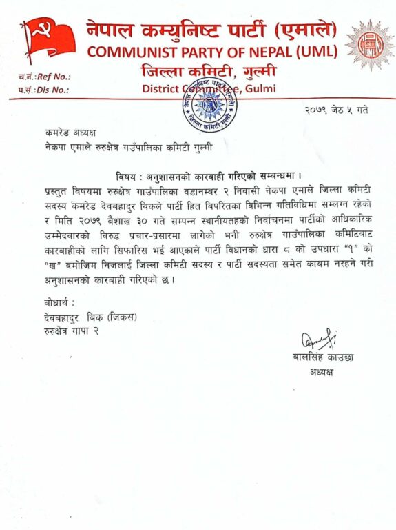 पार्टी बिधानको धारा ८ को उपधारा “ १“ को “ख“बमोजिम निज देबबहादुर बि क लाई जिल्ला कमिटी सदस्य र कुनै पनि संगठन र पार्टीको साधारण सदस्य समेत नरहने गरि पार्टिबाट निस्कासन गर्न रुरुक्षेत्र गाउँ कमिटीले नेकपा एमाले जिल्ला कमिटी गुल्मी लाई सिफारिस पत्र पठाए पछि जिल्ला कमिटी गुल्मीले कार्वाही गरेको छ ।