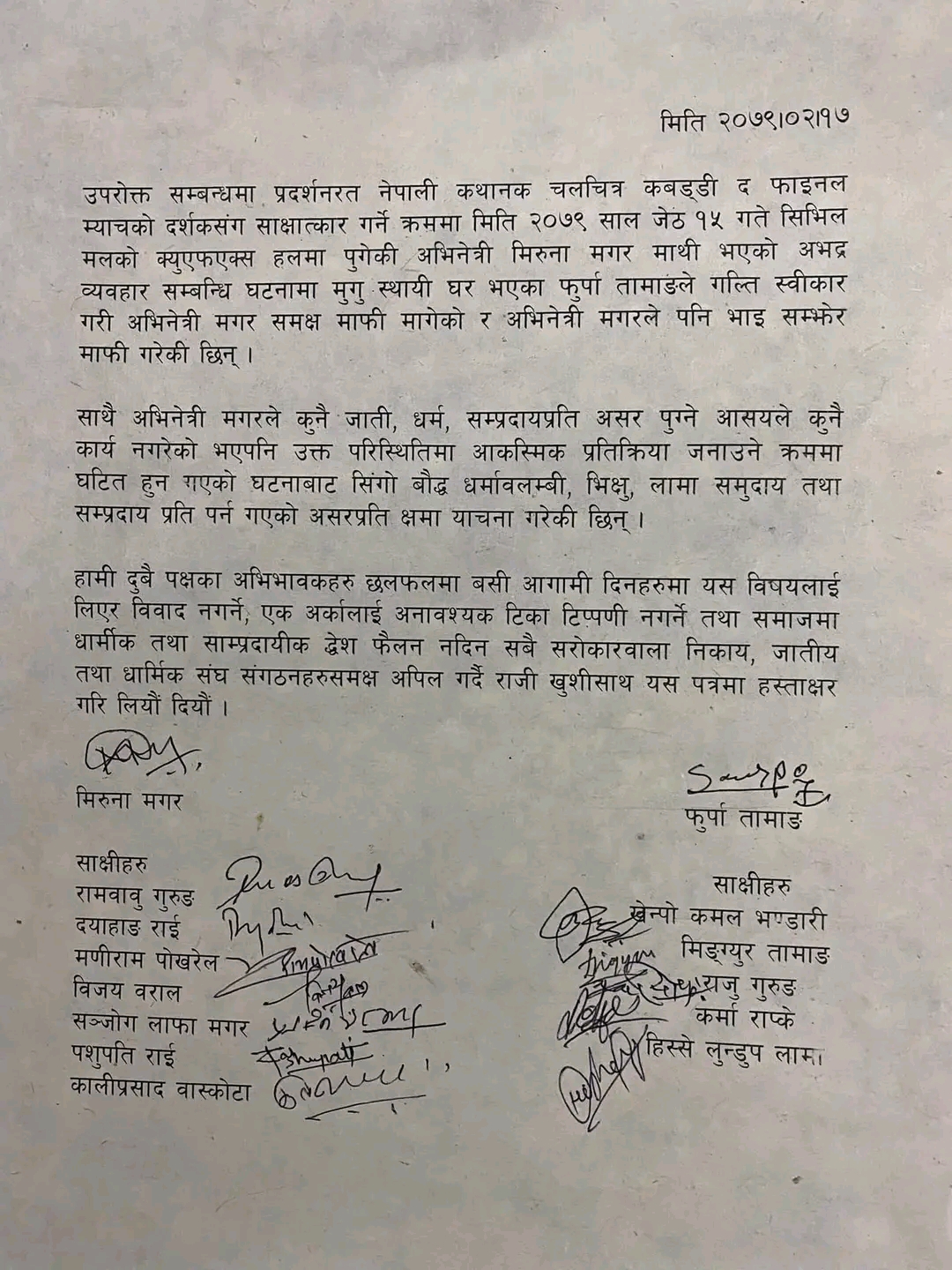 काठमाडौं,जेठ १७ । नायिका मिरुना मगर र फुर्बा लामाले एकाअर्कासंग माफी माग्दै क्षमायाचना गरेका छन् । खराब स्पर्श गरेको भन्दै नायिका मिरुनाले आरोपि फुर्बा तामाङलाई सोमबार झापड हानेकी थिइन । दुवैले आ–आफ्नो गल्ति स्वीकार गर्दै सहमतिपत्रमा समेत हस्ताक्षर गरेका छन् ।
