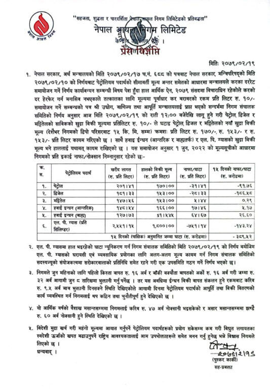 अर्थ मन्त्रालयले पूर्वाधार कर घटाएर मूल्य समायोजन गर्न लिखित निर्देशन दिएपछि पेट्रोलियम पदार्थको मूल्य घटाएको निगमले बताएको छ । अर्थमन्त्री जनार्दन शर्माले आगामी आर्थिक बर्ष २०७९–८० को बजेटमा सरकारले पेट्रोलमा लगाएको कर घटाउने घोषणा गरेका थिए । खाना पकाउने ग्याँस र हवाई इन्धनको मूल्य भने यथावत राखिएको छ ।