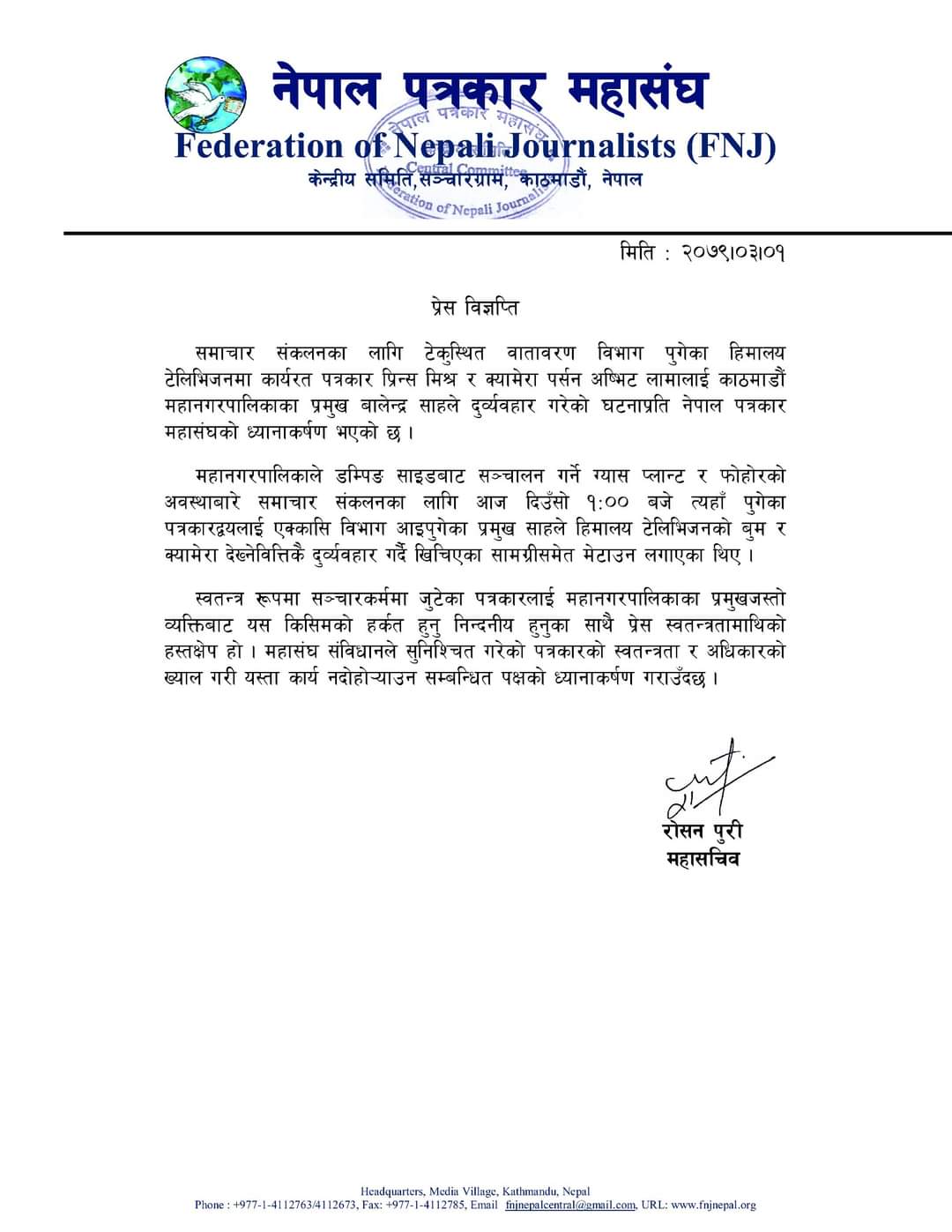काठमाडौं,असार १ । समाचार संकलनका लागि टेकुस्थित वातावरण विभाग पुगेका हिमालय टेलिभिजनमा कार्यरत पत्रकार प्रिन्स मिश्र र क्यामेरा पर्सन अष्भिट लामालाई काठमाडौं महानगरपालिकाका प्रमुख बालेन्द्र साहले दुर्व्यवहार गरेको घटनाप्रति नेपाल पत्रकार महासंघको ध्यानाकर्षण भएको छ ।