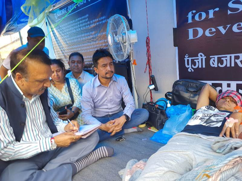 नेपाल धितोपत्र बोर्डको गेटमा पाल टाँगेर कोइराला ५ दिनदेखि अनशनरत छन् । यो बीचमा नेपाली काँग्रेसका प्रवक्ता प्रकाश शरण महतदेखि नेपाली काँग्रेसकै नेता रामहरि खतिवडा पनि खुमलटारमा उनलाई भेट्न पुगे । यी दुवै नेता कोइरालाको अनशन स्थलमा पुगेर सम्बन्धित निकायले ध्यान दिनु पर्ने भन्दै चर्काे भाषण पनि दिए । तर, यी दुवै नेताको पार्टी नेपाली काँग्रेस सरकारमा छ । सरकारमा आफ्नो पार्टी हुँदाहुँदै पनि विपक्षी पार्टीका नेताले जस्तो माग पुरा गराउन आँफूले पहल गर्ने बताएर लगानीकर्ताको मन भुल्याइरहेका छन् ।