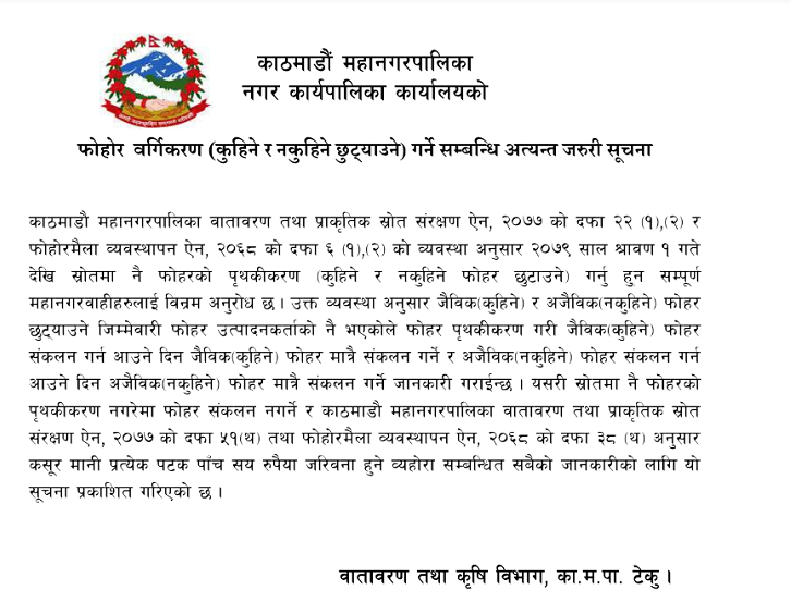 फोहरको वर्गीकरण नगरिएमा प्रतिव्यक्ति पाँच सय रुपैयाँ जरिबानासमेत हुने सूचनामा उल्लेख छ ।