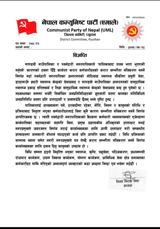 प्युठान,साउन २ । माण्डबी गाउँपालिका र स्वर्गद्वारी नगरपालिकाले करारका कर्मचारीलाई बिना कारण हटाईएको भन्दै नेकपा एमाले प्युठानले आपत्ती जनाएको छ।