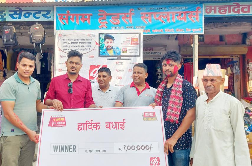 डिशहोमको तर्फ वाट एरिया सेल्स म्यानेजर निर्मल आचार्य, केदार ट्रडिङका प्रोप्राईटर लक्ष्मी दत्त पाण्डे र सेल्स अफिसर कमल रिमाल बाट जितेका पुरस्कार रकम हस्तान्तरण गरे । विजेता पन्तलाई हार्दिक वधाई दिदै सम्पुर्ण डिशहोम डि.टि.एच.का ग्राहकहरुले यो योजनामा सहभागी जनाई लाभ लिनुहुनेछ भन्ने विश्वास कम्पनीले लिएको छ ।
