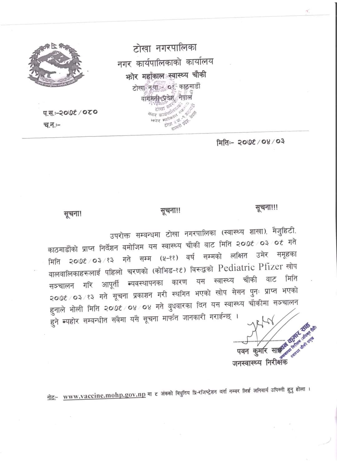 कोरोना विरुद्धको खोप लगाउन छुटेका (५-११) वर्ष उमेर समूहका बालबालिका Pediatric Pfizer खोप लगाउन लागिएको झोर महाँकाल स्वास्थ्य चौकीले जनाएको छ ।