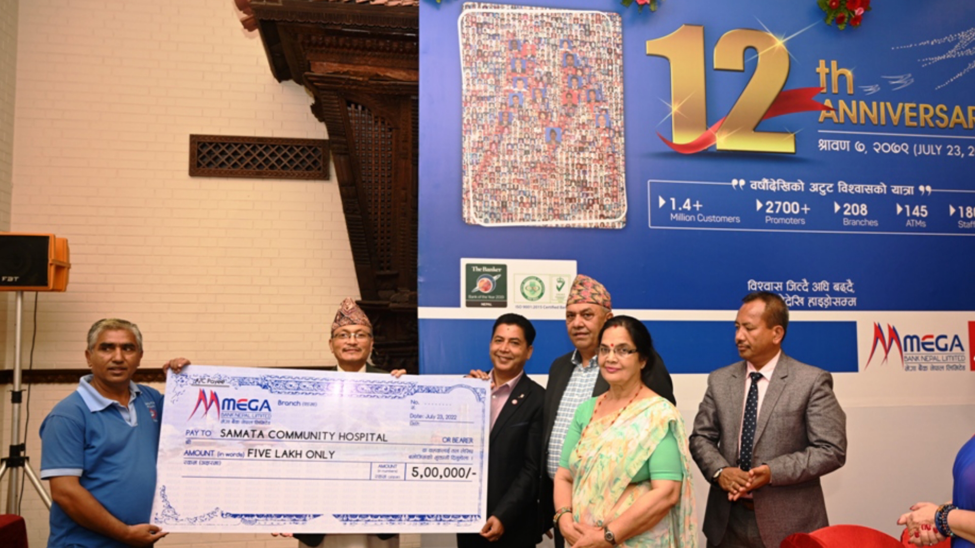 मेगा बैंक नेपाल लिमिटेडले १२औं बार्षिकोत्सवका अवसरमा संस्थागत सामाजिक उत्तरदायित्व अन्तरगत काठमाडौंको बौद्धस्थित समता सामुदायिक अस्पताललाई ५ लाख रुपैंया सहयोग गरेको छ । मेगा बैंकका अध्यक्ष शाहले समता अस्पतालका अध्यक्ष उत्तर सञ्जेललाई ५ लाख रुपैंयाको चेक हस्तान्तरण गरेका छन् । एक सय रुपैंयामा सर्वसाधारणको उपचार गराउँदै आएको यस अस्पतालबाट न्यून आय भएका सर्वसाधारणको उपचारमा मद्दत मिलोस् भन्ने उद्देश्यले आर्थिक सहयोग गरिएको मेगा बैंकले जनाएको छ ।