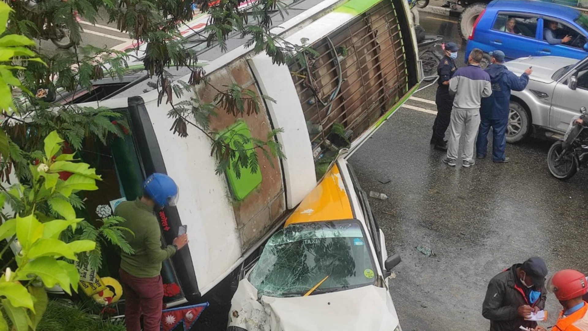 बा. ३ ख ४४४० नम्बरको बस बा. २ ज ६०१ नम्बरको ट्याक्सीमाथि पल्टिँदा ३ जना घाइते भएका छन् ।