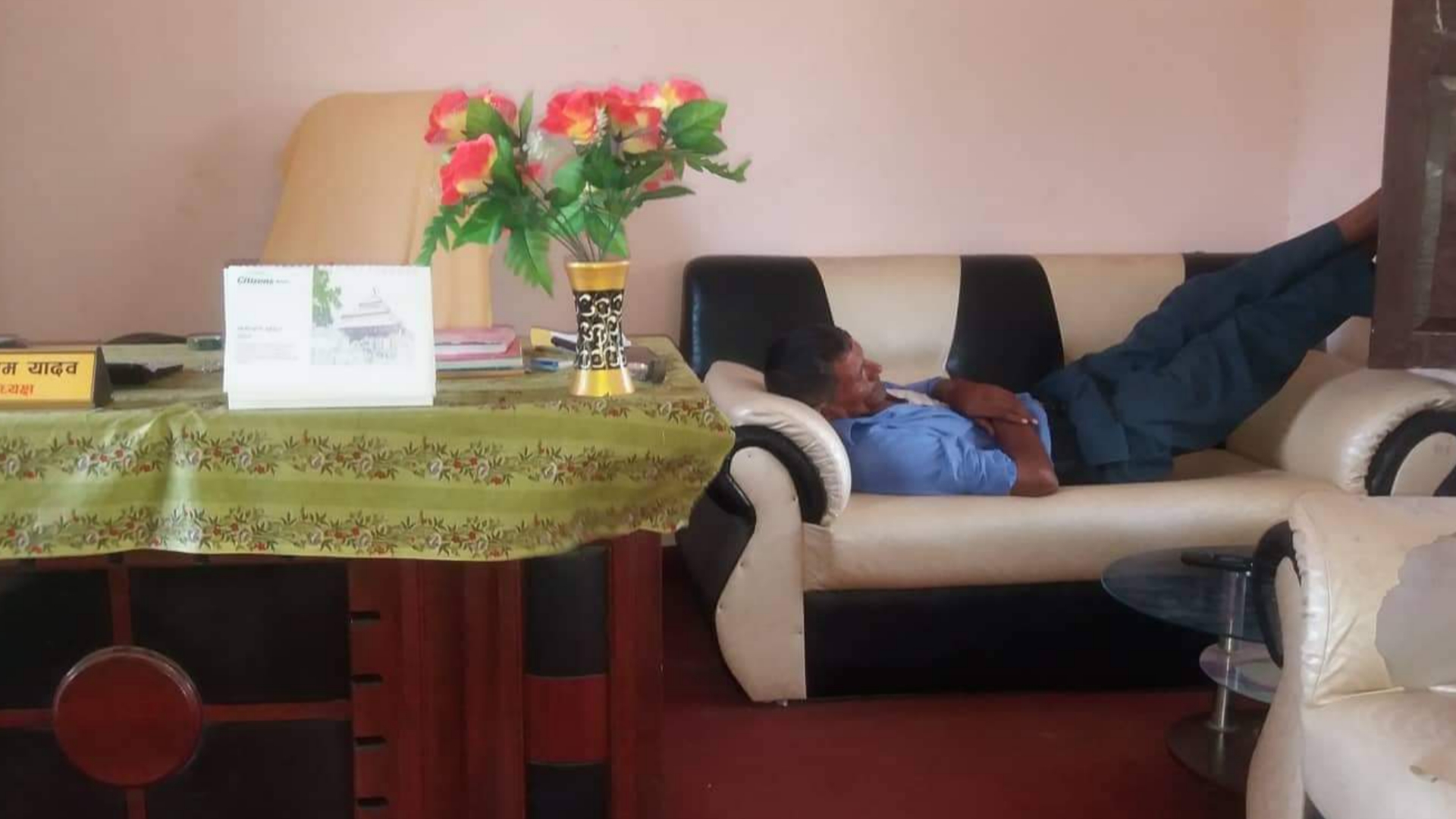 वडा अध्यक्ष यादव कार्यालय समयमै कार्यकक्षमा रहेको शोफामा मस्त निदाएको तस्वीरमा देखिएको छ। वडा अध्यक्ष यादव दुबै खुट्टा माथि गरेर निदाएको देख्न सकिन्छ । अध्यक्ष कार्यकक्षमा निदाउदा सेवाग्राहीको काम समेत प्रभावित भएको छ ।
