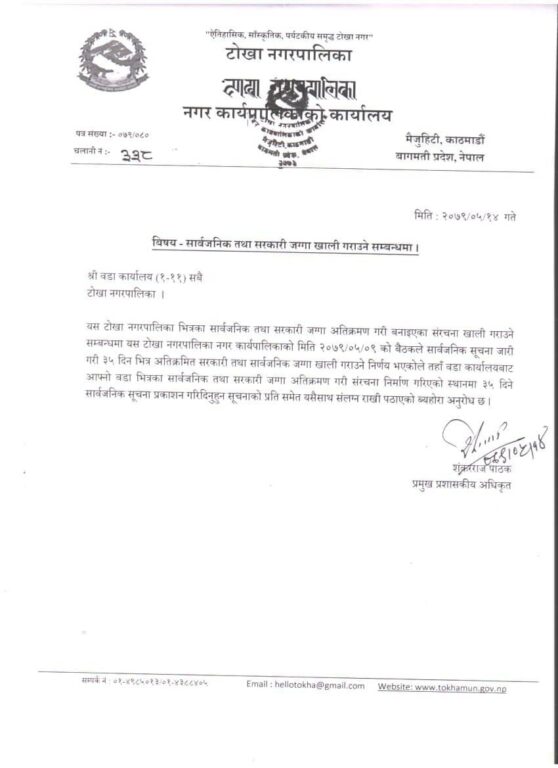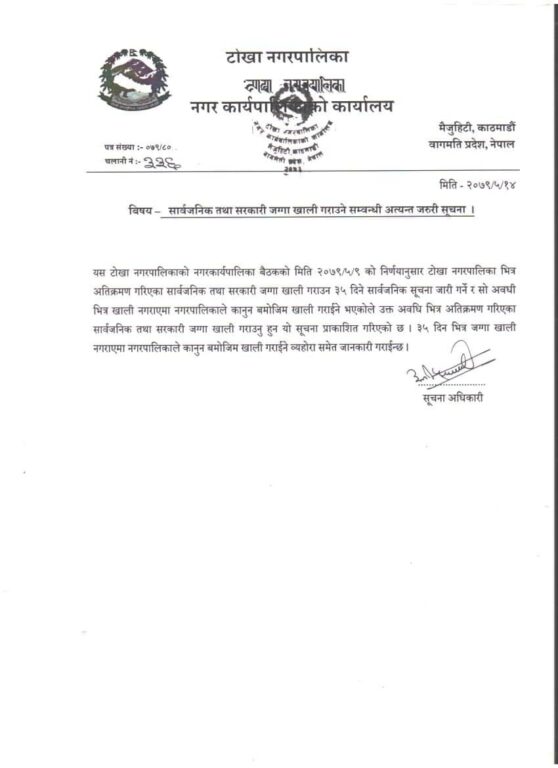 टोखा नगर भित्र अतिक्रमण गरिएका सार्वजनिक तथा सरकारी जग्गा खाली गर्न ३५ दिने सुचना जारी