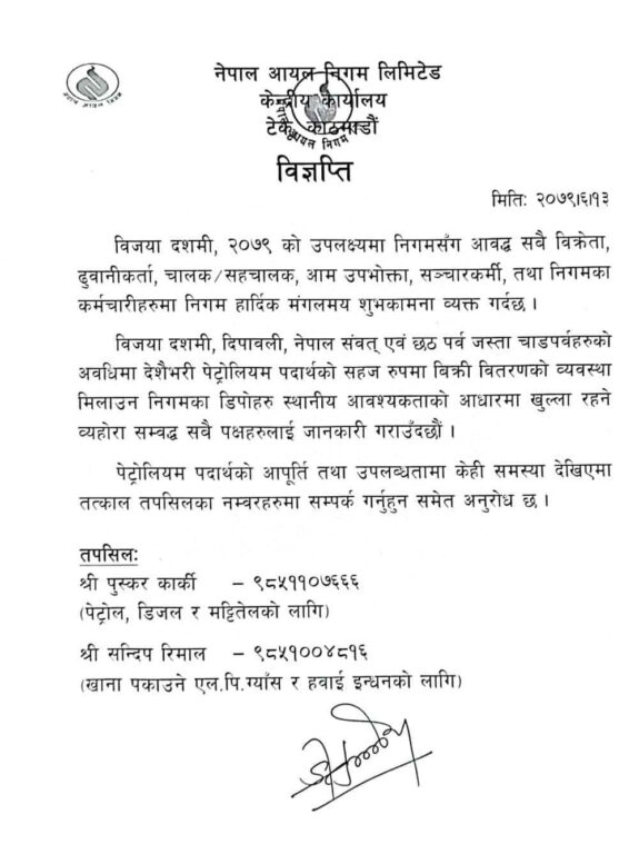 काठमाडौं,असोज १३ । दशैंको बेलामा पनि नेपाल आयल नियमको देशभरका विभिन्न शाखा कार्यालय खुला रहने भएको छ ।