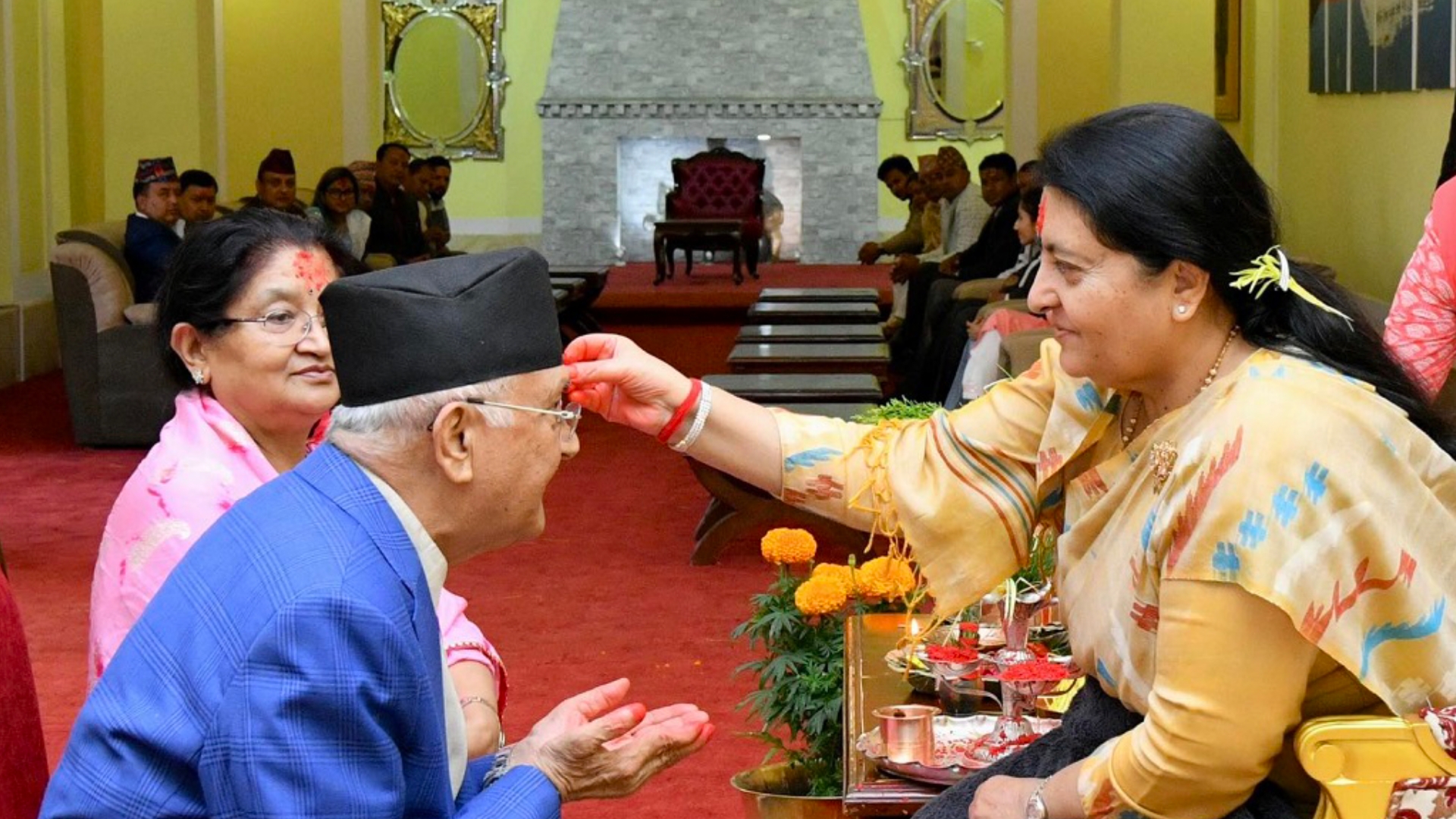 बुधबार बिहान दमकस्थित आफ्नै निवासमा बिहान ११ बजेर ५१ मिनेटको शुभसाइतमा बुबा मोहनप्रसाद ओलीको हातबाट टिका ग्रहण गरेर ओली दम्पत्ती राष्ट्रपतिको हातबाट टीका लगाउन शीतल निवास पुगेका थिए ।