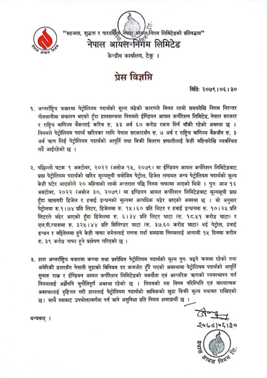 अन्तर्राष्ट्रिय बजारमै पेट्रोलियम पदार्थको मूल्य बढेपछि आइतबार इण्डियन आयल कर्पोरेसनले पठाएको नेपाल आयल निगमले जनाएको छ ।