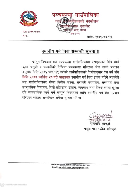 नुवाकोट,कात्तिक २५ । जिल्लाको पञ्चकन्या गाउँपालिकामा यहीँ २७ गते आइतबार सार्वजनिक बिदा दिइएको छ ।