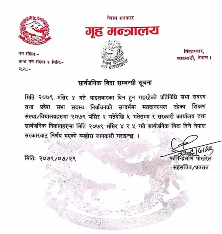 मंसिर ४ र ५ गते सार्वजनिक बिदा दिने सरकारको निर्णय