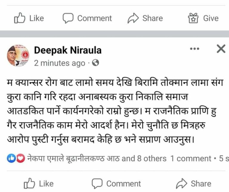 उनले सामाजिक सञ्चाल फेसबुकमा क्यान्सर रोगबाट लामो समयदेखि बिरामी परेर थपिएका तोक्मान लामासँग कुराकानी गरिरहेका बेला अनावश्यक आरोप लगाएको बताएका छन् । उनले आफूमाथि अनावश्यक आरोप लगाउनेहरुलाई आरोप प्रमाणित गर्न खुला चुनौती दिएका छन् ।