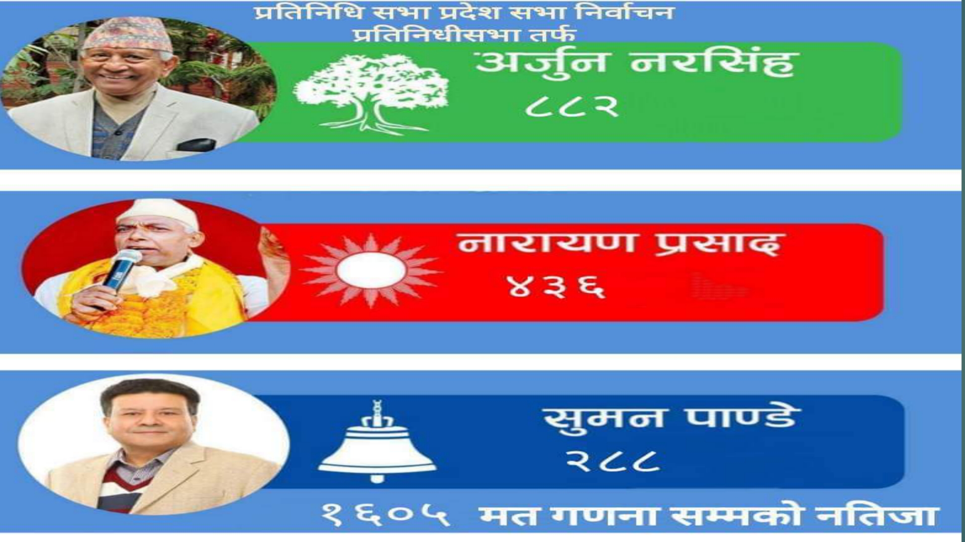 त्यस्तै एमालेका नारायण प्रसाद खतिवडाले ४३६ र राष्ट्रिय स्वतन्त्र पार्टीका उम्मेदवार सुमन पाण्डेले २८८ मत हासिल गरेका छन् ।
