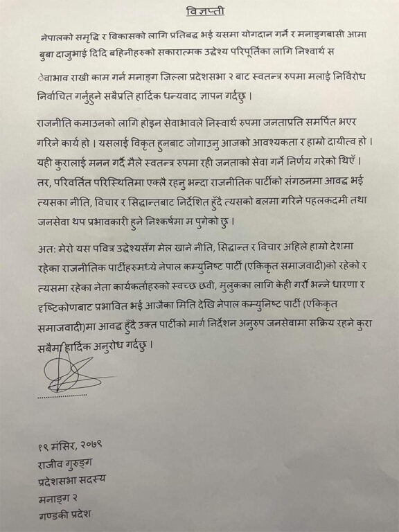 गण्डकी प्रदेश सभा सदस्य दीपक मनाङे नेकपा एकीकृत समाजवादीमा प्रवेश