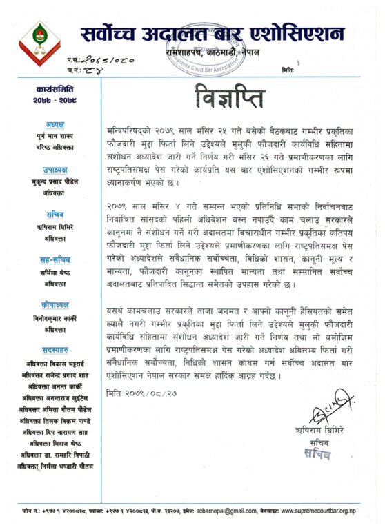 राष्ट्रपतिसमक्ष पेस अध्यादेश तत्काल फिर्ता गर्न सर्वोच्च बारको आग्रह